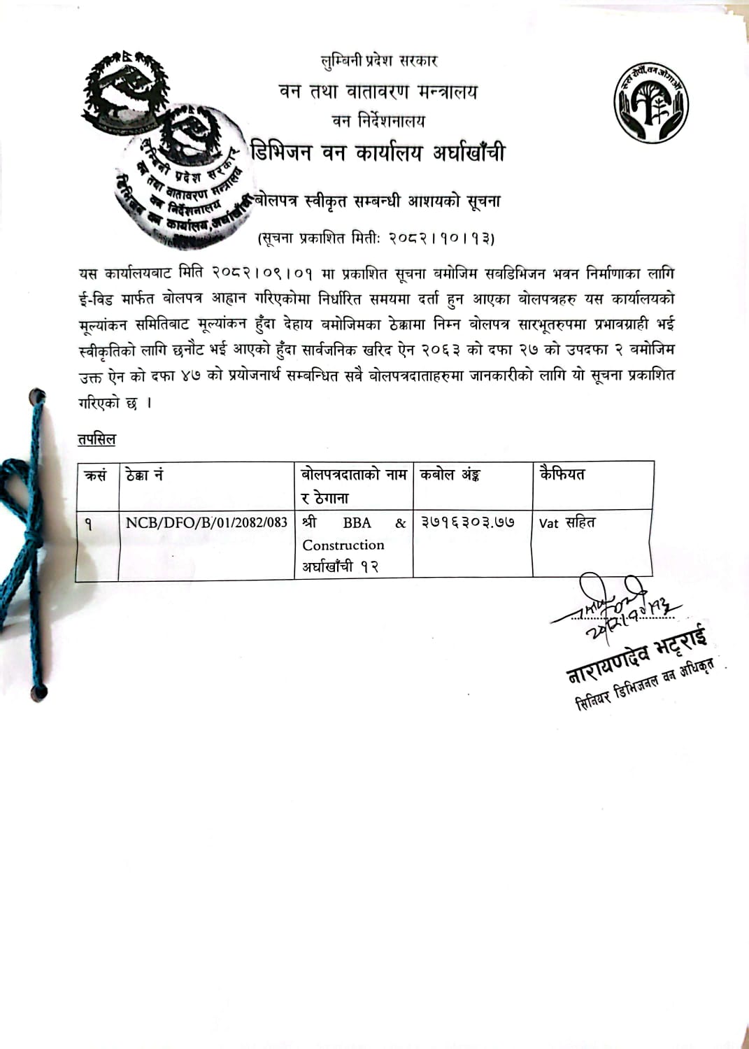 बोलपत्र स्विकृत गर्ने आसयको सुचना